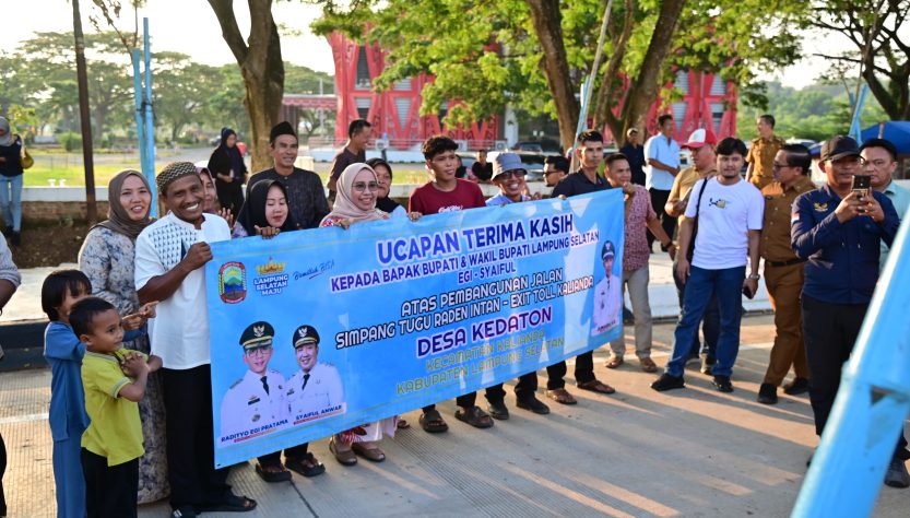 Antusiasme warga semakin terlihat dengan adanya banner yang dibentangkan bertuliskan: “Terimakasih Kepada Bapak Bupati dan Wakil Bupati Lampung Selatan Egi–Syaiful atas Pembangunan Jalan Simpang Tugu Raden Intan – Exit Tol Kalianda.”